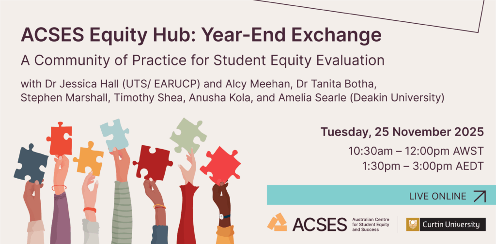 The Australian Centre for Student Equity and Success acknowledges Indigenous peoples across Australia as the Traditional Owners of the lands on which the nation’s campuses are situated. With a history spanning more than 60,000 years as the original educators, Indigenous peoples hold a unique place in our nation. We recognise the importance of their knowledge and culture, and reflect the principles of participation, equity, and cultural respect in our work. We pay our respects to Elders past, present, and future, and consider it an honour to learn from our Indigenous colleagues, partners, and friends.
